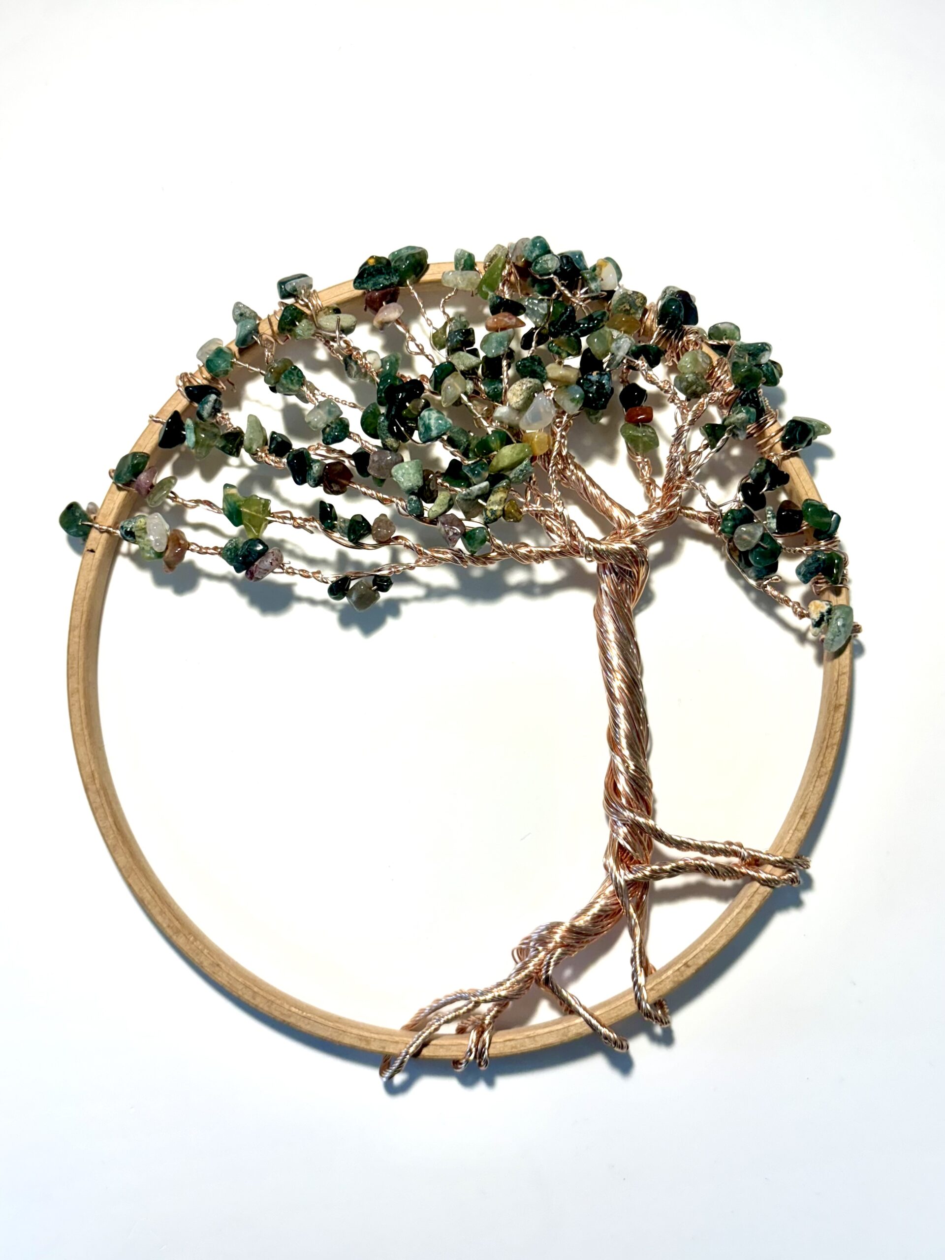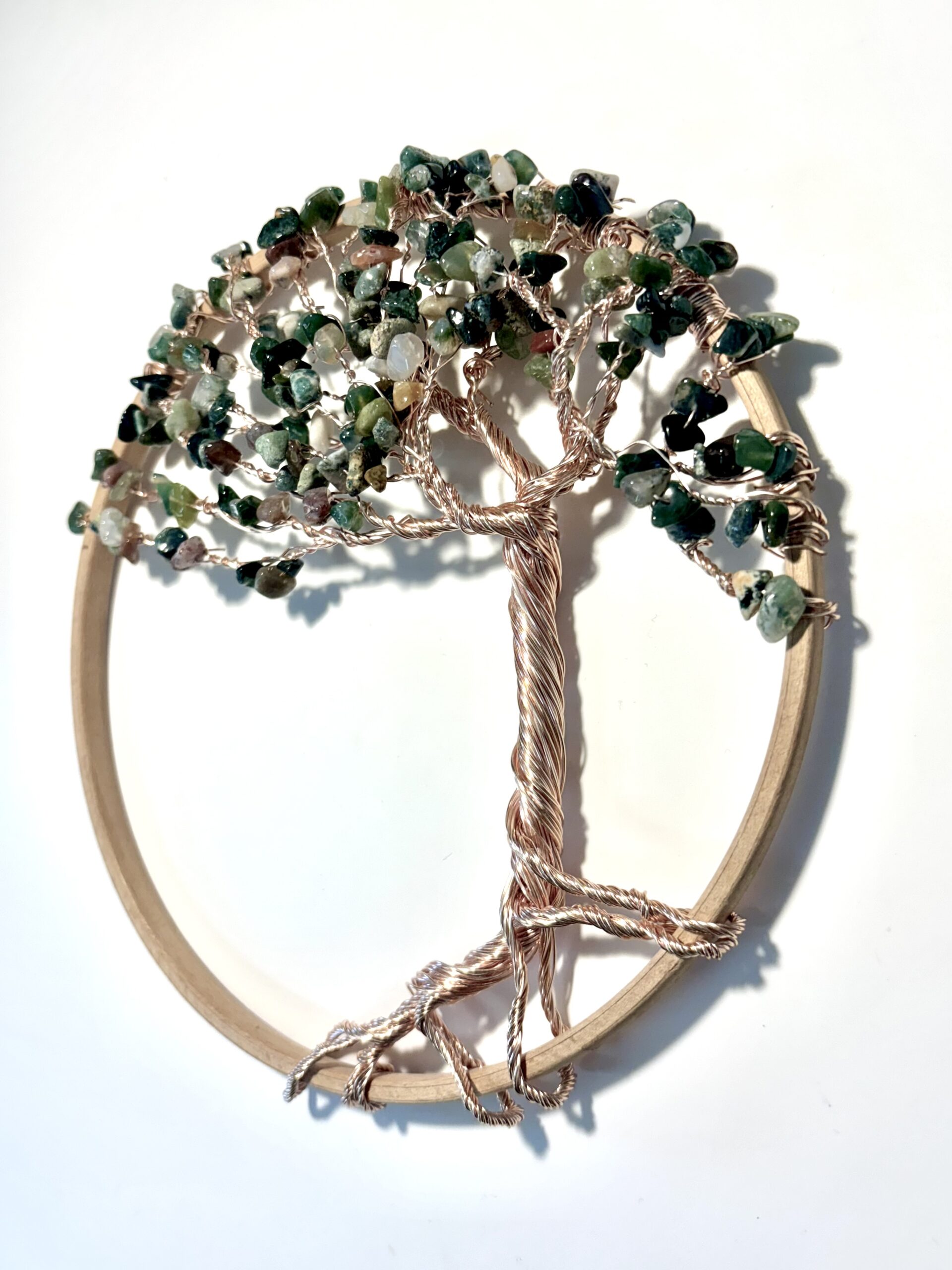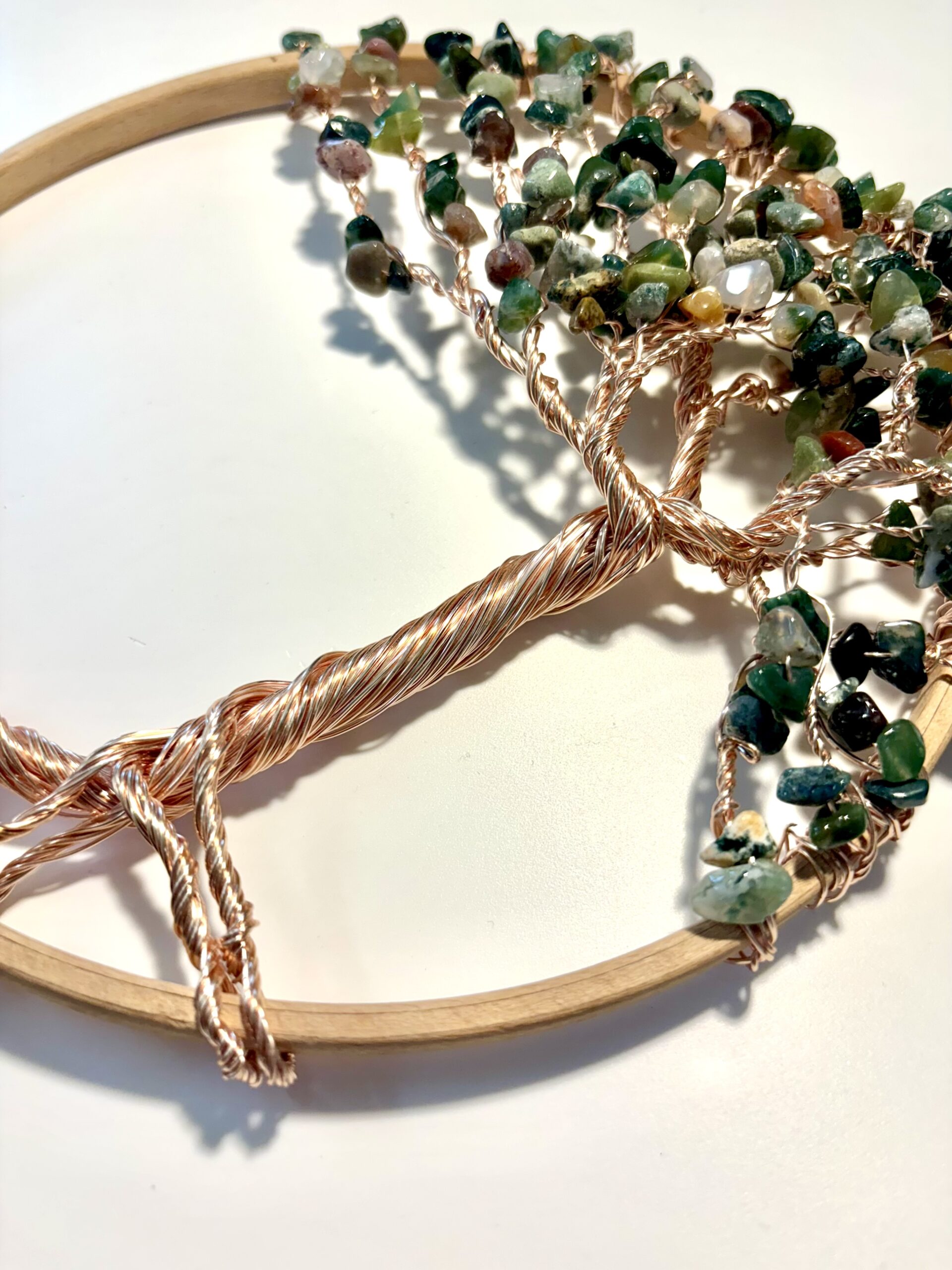 Individual crystal gemstones are intricately threaded onto delicate wire and bound around a circular wooden or metal hoop. The Tree of life sculpture symbolises the beauty of nature meeting the strength of the industrial history that is so prominent in Rachel Aker’s beloved city of Birmingham.